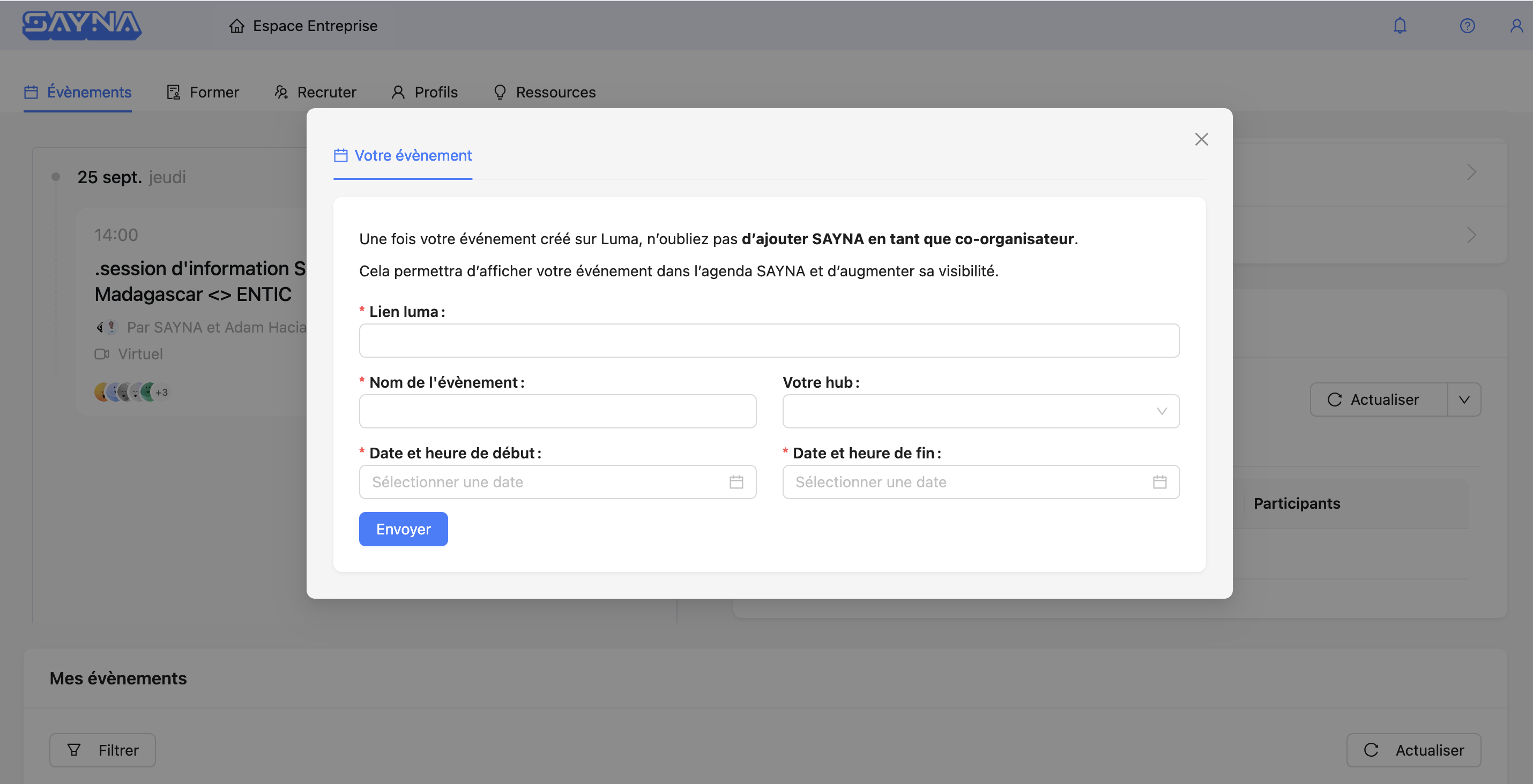 Vous allez être redirigé sur la plateforme Luma, il faudra vous créer un compte, créer un évènement et mettre SAYNA en co-organisateur.