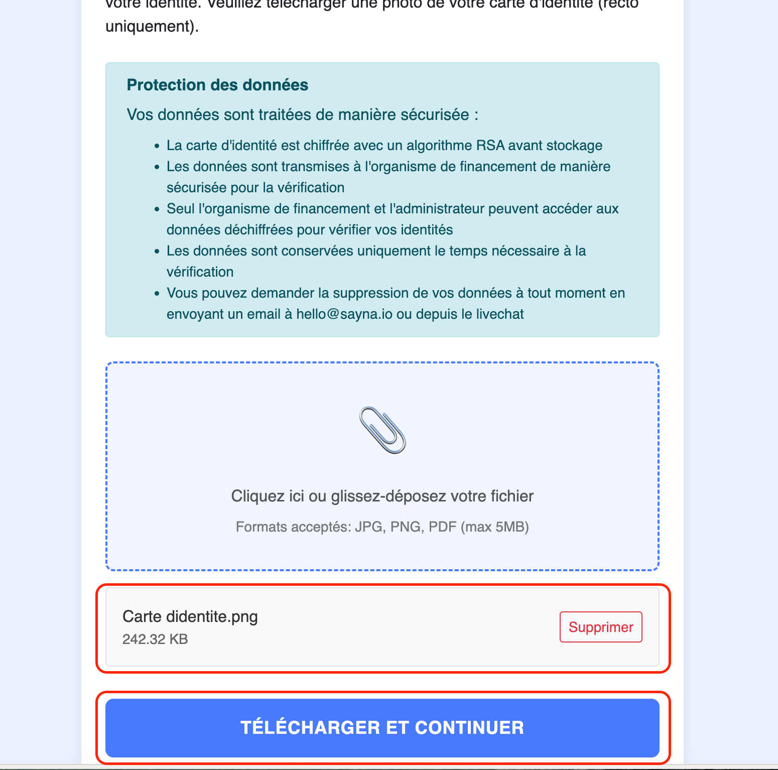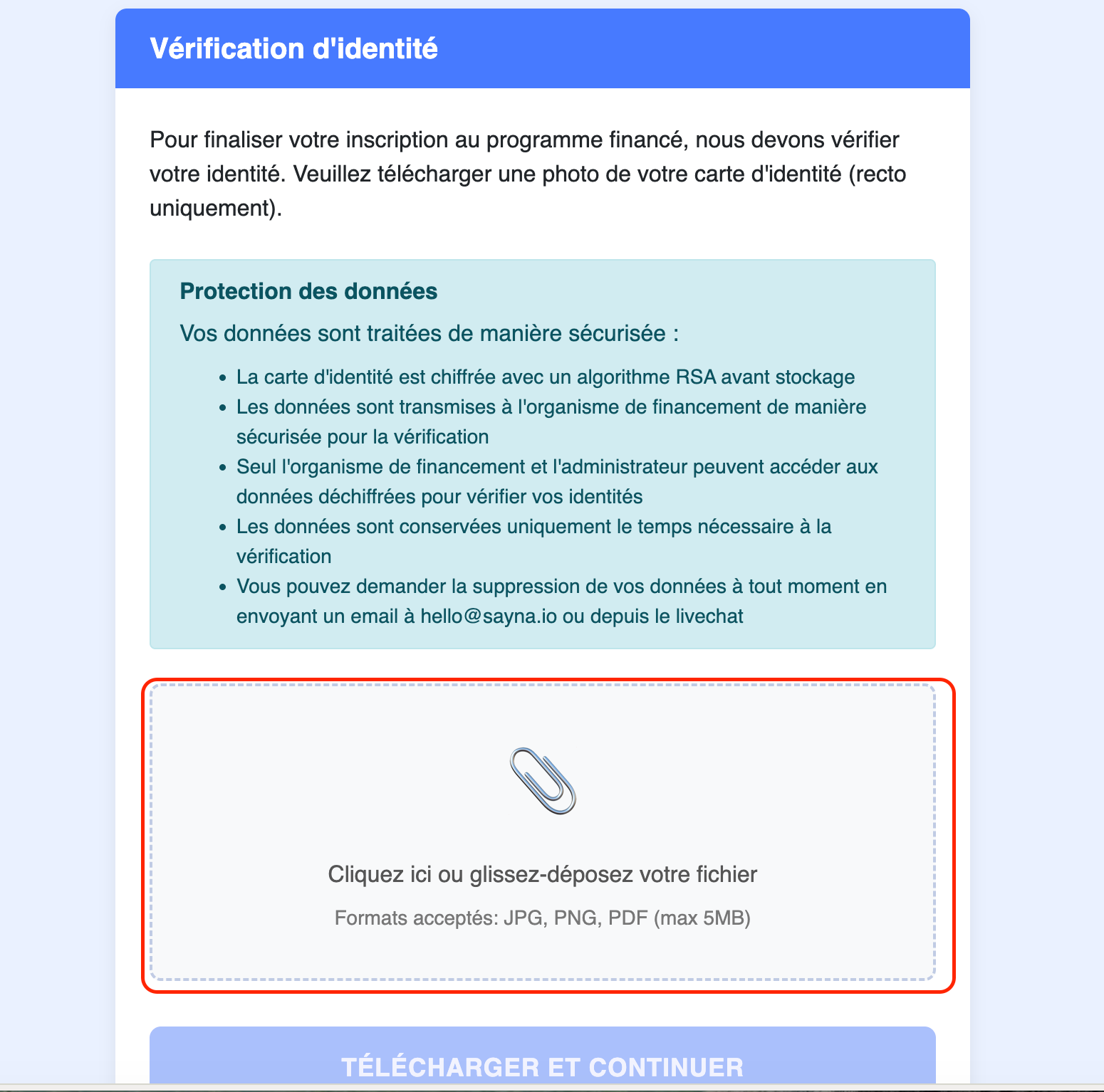 Si vous avez signé la lettre d’engagement et que vous n’avez pas encore transmis votre pièce d’identité, vous serez automatiquement amené sur la page de Vérification d’identité.