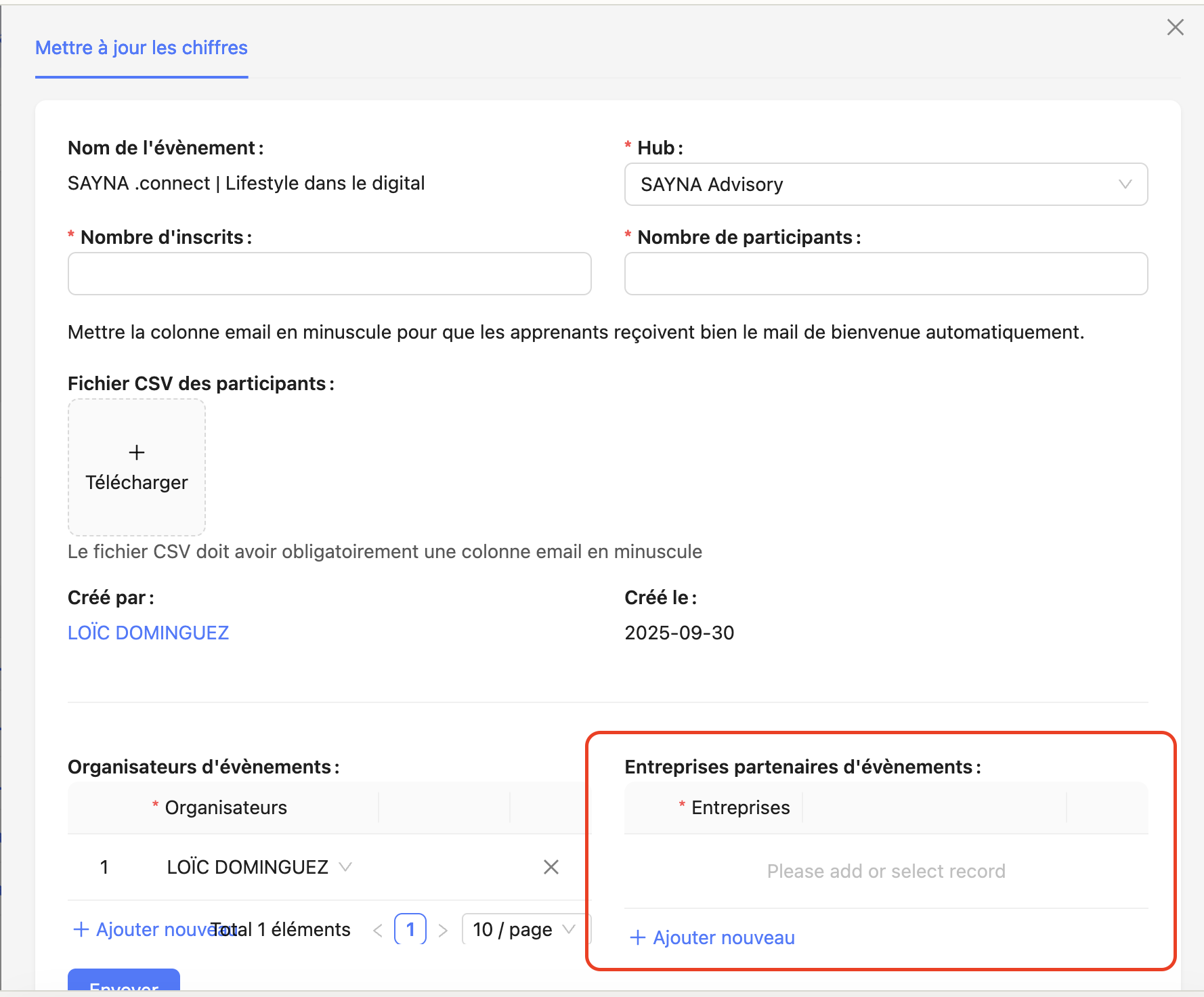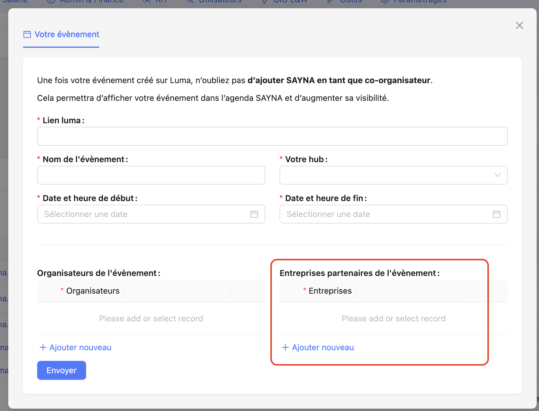 - Dans la section Entreprises partenaires de l’évènement cliquer sur le bouton “Ajouter nouveau” et sélectionner le nom de l’entreprises. S’il y a plusieurs entreprises partenaires l’évènement, vous pouvez en ajouter autant que nécessaire.